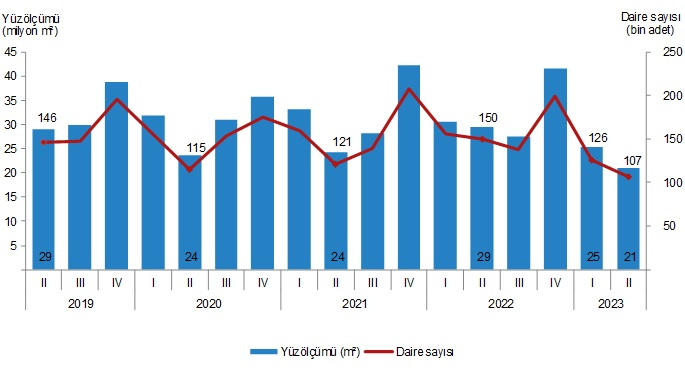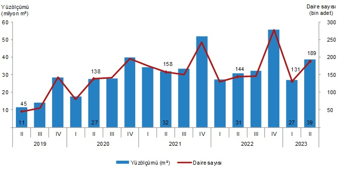 Belediyeler tarafından 2023 yılı II. çeyreğinde yapı ruhsatı verilen yapıların toplam yüzölçümü 38,6 milyon m² iken; bunun 20,0 milyon m²’si konut, 10,1 milyon m²’si konut dışı ve 8,4 milyon m²’si ise ortak kullanım alanı olarak gerçekleşti.