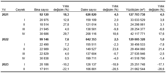 Bir önceki yılın aynı çeyreğine göre, 2023 yılı II. çeyreğinde belediyeler tarafından yapı kullanma izin belgesi verilen yapıların bina sayısı %22,1, daire sayısı %28,5 ve yüzölçümü %28,6 azaldı.