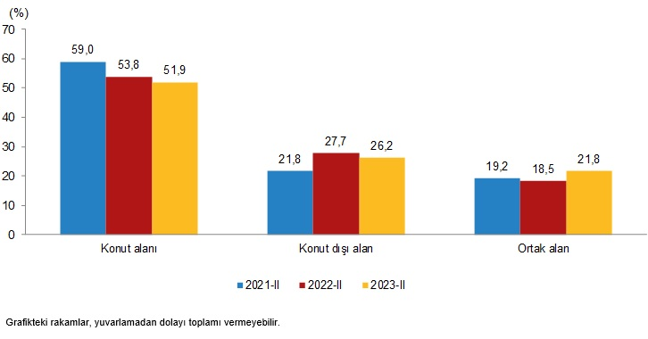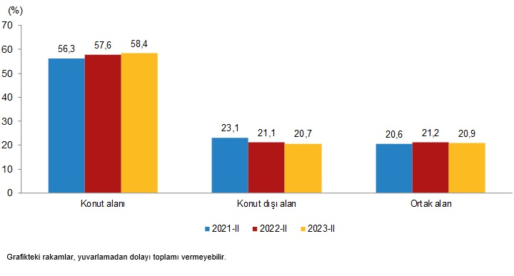 Yapı kullanma izin belgesine göre konut, konut dışı ve ortak alanların yüzölçümü payları, II. Çeyrek, 2021-2023
