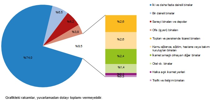 En yüksek yüzölçüm payı %74,0 ile iki ve daha fazla daireli binaların oldu