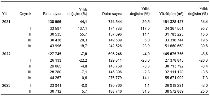 Yapı ruhsatı verilen yapıların yüzölçümü %25,6 arttı.Bir önceki yılın aynı çeyreğine göre, 2023 yılı II. çeyreğinde belediyeler tarafından yapı ruhsatı verilen yapıların bina sayısı %5,7, daire sayısı %31,3 ve yüzölçümü %25,6 arttı.