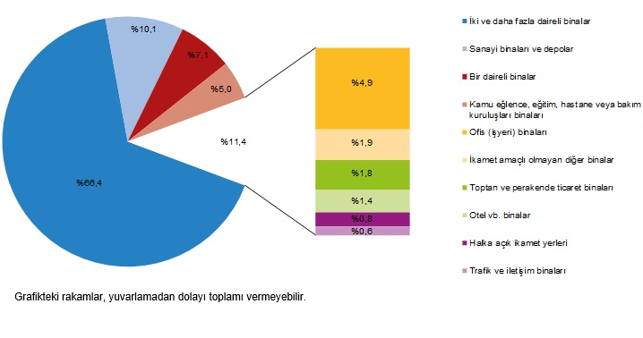 En yüksek yüzölçüm payı %66,4 ile iki ve daha fazla daireli binaların oldu