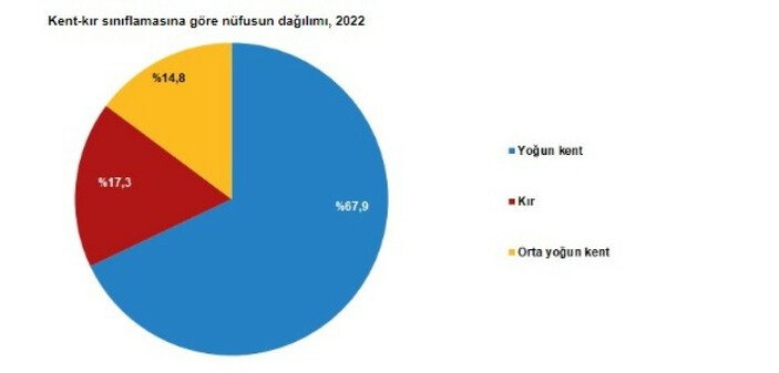 Türkiye İstatistik Kurumu (TÜİK), 2022 yılı Kent-Kır Nüfus İstatistikleri’ni paylaştı. Buna göre, Türkiye’nin toplam yüzölçümünün sadece yüzde 1,6’sını oluşturan yoğun kent olarak sınıflandırılan yerleşim yerlerinde 31 Aralık 2022 tarihi itibarıyla 57 milyon 934 bin 583 kişi yaşamaktadır. Diğer bir ifadeyle Türkiye nüfusunun yüzde 67,9’u söz konusu yerleşim yerlerinde ikamet ediyor.